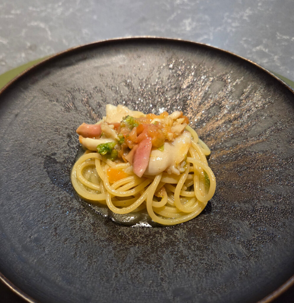 : 북방조개, 머위꽃, 토마토를 넣은 스파게티.